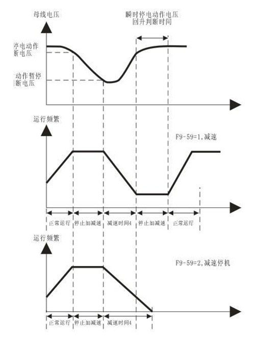 6.1此功能只在停电瞬间变频器不会故障停机,而是降低输出频率,通过负载回馈能量,补充电压降低,以维持变频器短时间内继续工作。