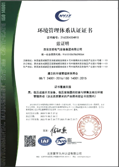 环境体系证书-西安亚欧电气设备集团有限公司 | 西安高压成套开关柜 | 西安低压成套开关柜 | 西安箱式变电站 | 陕科配件 | 汇创达变频器 | 陕西变频器一体机 | 陕西变频器维修