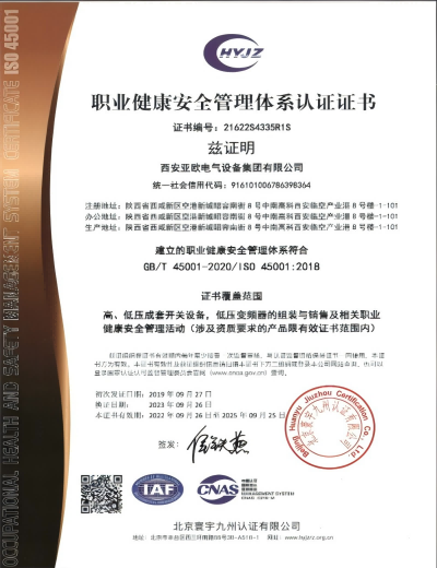 安全体系证书-西安亚欧电气设备集团有限公司 | 西安高压成套开关柜 | 西安低压成套开关柜 | 西安箱式变电站 | 陕科配件 | 汇创达变频器 | 陕西变频器一体机 | 陕西变频器维修